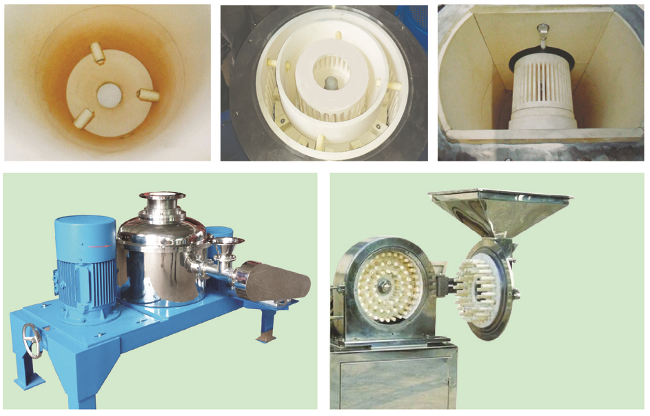 该设备由于其耐磨件采用了高纯的氧化铝和氧化错等高耐磨材料,其他过流元件也采用了进口高分子材料和高耐磨尼龙材料,保证了物料在粉碎过程中的高纯度的要求,做到了无污染的效果。