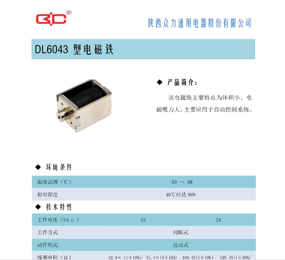 ● DL6043型电磁铁 工作电压: 12/24V 工作方式: 间断式 动作形式: 拉动式 电磁吸力: ≥0.4-0.5Kg